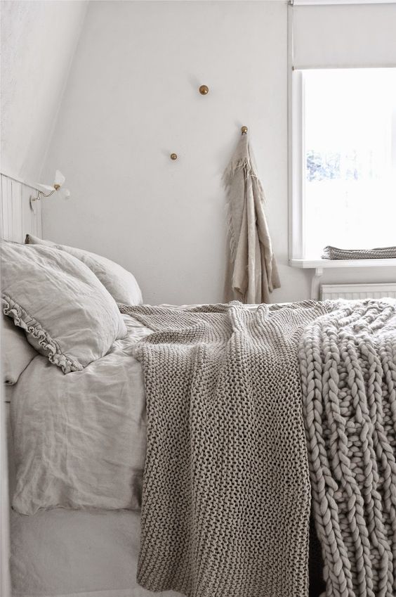 τα γκρι υφάσματα, ειδικά τα πλεκτά, κάνουν αυτό το υπνοδωμάτιο πολύ φιλόξενο και γαλήνιο