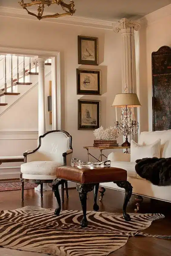 ένα όμορφο vintage σαλόνι με έναν ουδέτερο καναπέ, μια λευκή καρέκλα αντίκα, ένα δερμάτινο σκαμπό, ένα χαλί με στάμπα ζέβρας και έναν πλέγμα γκαλερί