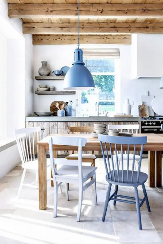 μια όμορφη κουζίνα με μοντέρνα ντουλάπια από σκυρόδεμα και ξύλο, μια ρουστίκ τραπεζαρία, αταίριαστες vintage καρέκλες και μια μπλε λάμπα