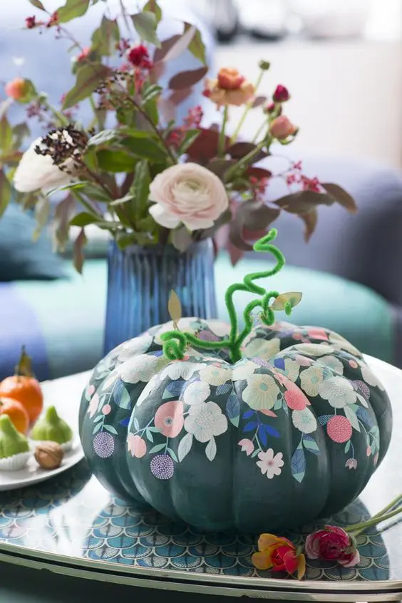 γαλάζιες κολοκύθες με έντονα ζωγραφισμένα άνθη είναι εκπληκτικές για τη φθινοπωρινή σας διακόσμηση