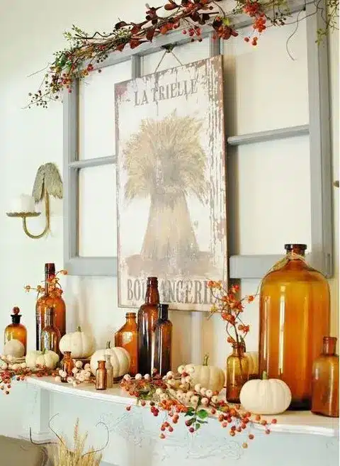 ένα τολμηρό ρουστίκ φθινοπωρινό τζάκι με μούρα και πράσινο, λευκές κολοκύθες, κεχριμπαρένια μπουκάλια, ένα έργο τέχνης και μούρα