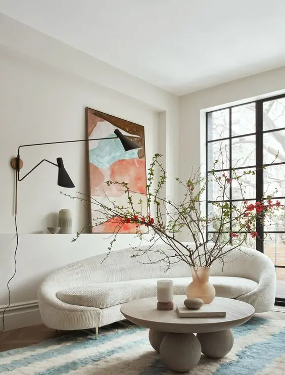 ένα εκλεπτυσμένο σαλόνι με κυρτό λευκό καναπέ και ελκυστική διακόσμηση και έργα τέχνης που συνεχίζουν το μοναδικό στυλ του δωματίου