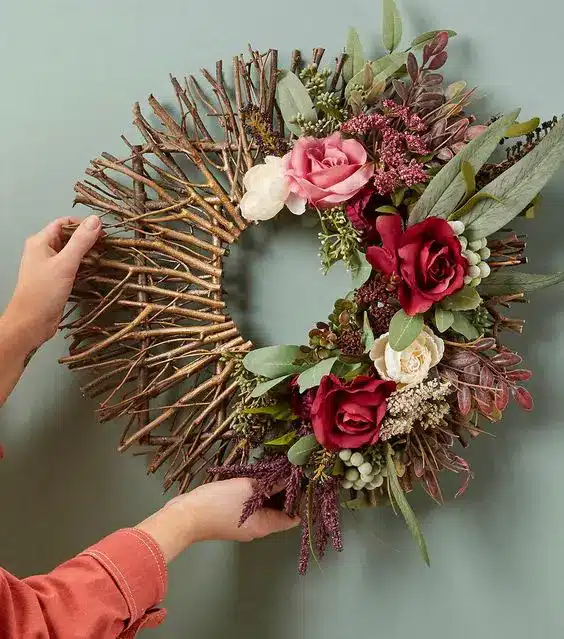όμορφη diy Φθινοπωρινή διακόσμηση με ένα κομψό στεφάνι από κλαδιά, πρασινάδα και άνθη