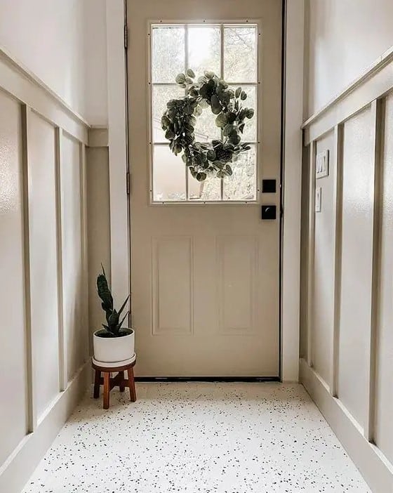 μια όμορφη greige είσοδος με ρολό και μια ασορτί πόρτα, ένα λευκό δάπεδο terrazzo και λίγο πράσινο που ζωντανεύει τον χώρο