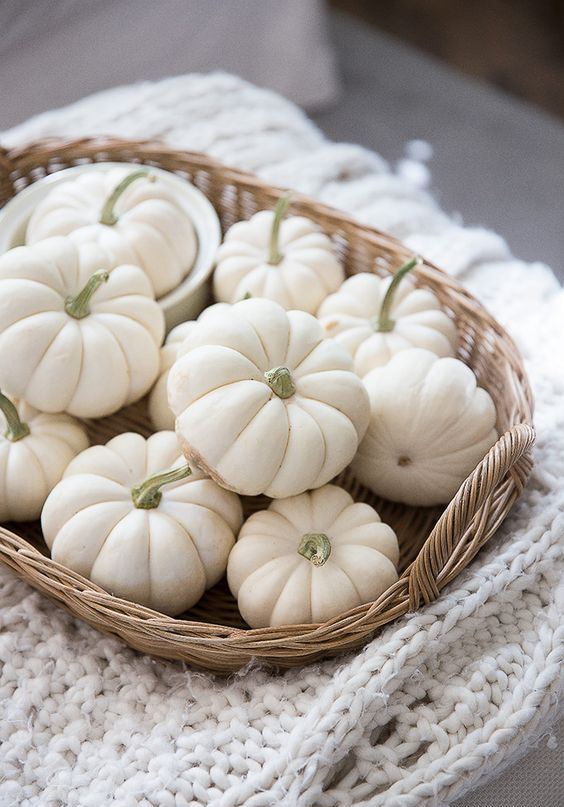 Τα πράγματα που είναι εύκολο να βρεθούν σε λευκό χρώμα είναι οι λευκές κολοκύθες, τα βάζα, τα έπιπλα και τα υφάσματα. Φυσικά, μπορείτε να προσθέσετε μερικά λευκά αξεσουάρ – ή σε άλλα χρώματα, αν θέλετε. Εάν δεν μπορείτε να βρείτε φυσικές άσπρες κολοκύθες, μπορείτε να τις βάψετε. Αν αγαπάτε τη φυσική διακόσμηση του σπιτιού σας, δημιουργήστε φανταστικές συνθέσεις από λευκές κολοκύθες, άνθη, κέρατα, γρασίδι και κεριά, τα οποία θα δώσουν φυσικότητα και κομψότητα στο σπίτι σας.