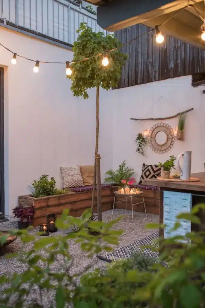 Αναρριχώμενα φυτά και λουλούδια όπου υπάρχει χώρος, μικρές ξύλινες πέργκολες, θα πρόσθεταν χρώμα στον μικρό σας κήπο. Φυτά, ράφια και κάθε είδους κατασκευές που μπορούν να αγγίξουν τον τοίχο ή να κρεμαστούν γλάστρες – ζαρντινιέρες που αν τις τοποθετούσατε με συμβατικό τρόπο θα κλείνατε τον διαθέσιμο ελεύθερο χώρο.