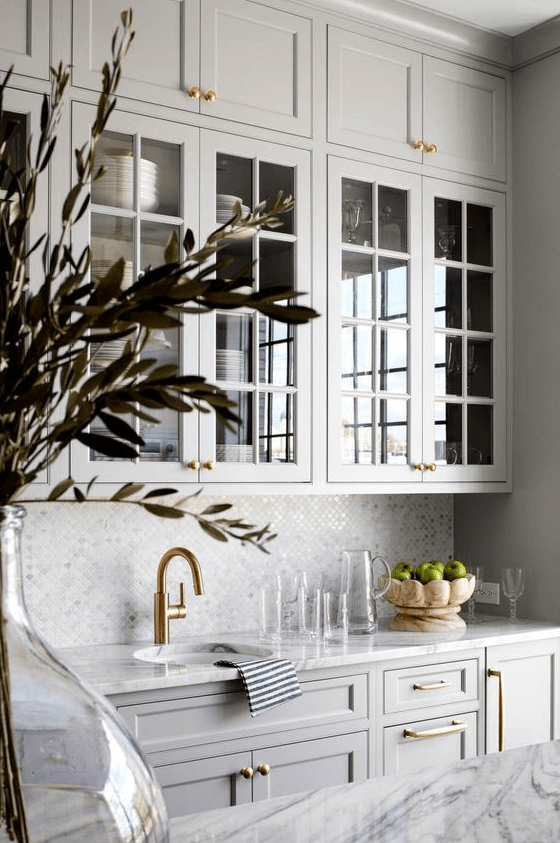 μια όμορφη γκρι κουζίνα με γυάλινα μπροστινά ντουλάπια, ένα πλακάκι και έναν πάγκο από λευκό μάρμαρο και χρυσές λαβές