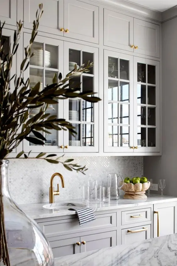 μια όμορφη γκρι κουζίνα με σέικερ και γυάλινα μπροστινά ντουλάπια, ένα πλακάκι και έναν πάγκο από λευκό μάρμαρο και χρυσά χερούλια