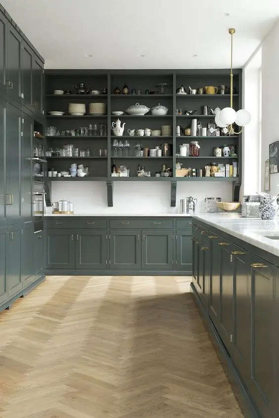 μια όμορφη σκούρα πράσινη κουζίνα αγγλικής έμπνευσης με σέικερ και ανοιχτά ντουλάπια, λευκούς πάγκους και μπρούτζινα και χρυσά φωτιστικά