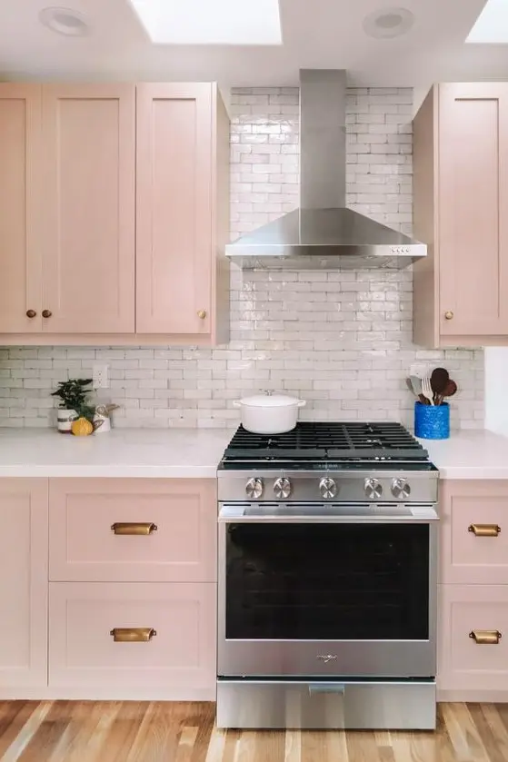 μια όμορφη ροζ κουζίνα με χάλκινα πόμολα, λευκά πλακάκια και φεγγίτες