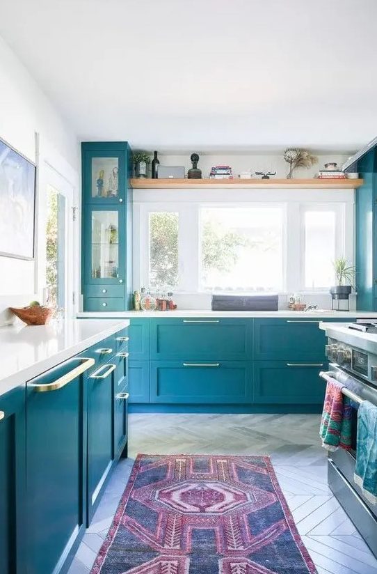 μια όμορφη μπλε κουζίνα με πολύ φυσικό φως, πινελιές από χρυσό και λευκό πάγκο