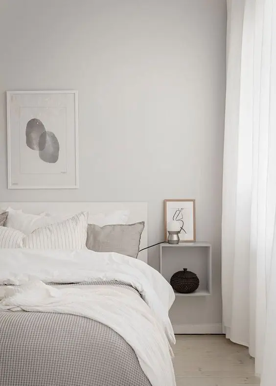 ένα όμορφο μινιμαλιστικό υπνοδωμάτιο με μονόχρωμο συνδυασμό χρωμάτων, ανοιχτό γκρι τοίχους, ένα κρεμ κρεβάτι με γκρι και λευκά κλινοσκεπάσματα, ένα επιτοίχιο κομοδίνο και ένα φωτιστικό δαπέδου