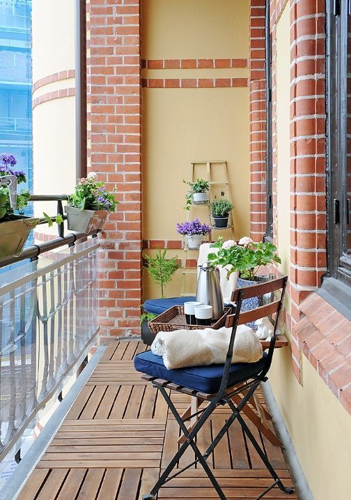Αν το μπαλκόνι σας είναι πολύ μικρό, σκεφτείτε να χρησιμοποιήσετε πτυσσόμενες καρέκλες και τραπέζι. Μπορείτε να τα διακοσμήσετε με μερικές κουβέρτες, πολύχρωμα μαξιλάρια, καλύμματα από ψεύτικη γούνα για κρύα βράδια και πολλά άλλα. Μπορείτε να βάψετε τα έπιπλα σε παστέλ χρώματα ή απλώς να προσθέσετε πολύχρωμα και λουλουδάτα υφάσματα όπως χαλιά και καλύμματα. Μια ακόμη ιδέα είναι να χρησιμοποιήσετε σκαμπό διαφόρων μεγεθών ως καθίσματα και βοηθητικά τραπέζια.