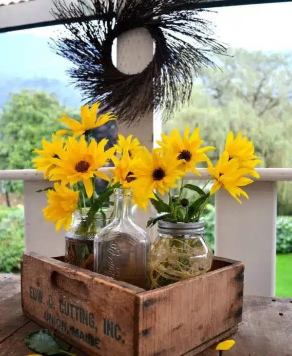 Αν θέλετε να βάλετε στο τραπέζι στη βεράντα με ένα μπουκέτο φρέσκα λουλούδια, μπορείτε να χρησιμοποιήσετε μερικά βάζα. Για πιο όμορφο αποτέλεσμα χρησιμοποιήστε ένα μικρό ξύλινο κουτί. Τοποθετήστε 3 ή 4 βάζα διαφορετικών μεγεθών στο δοχείο και γεμίστε το με φρέσκα λουλούδια.