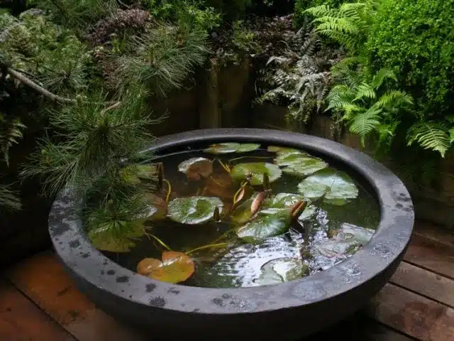 Το μόνο που χρειάζεστε είναι ένα δοχείο οποιουδήποτε μεγέθους, μερικά φυτά και ίσως ακόμη και ψάρια. Το πώς θα διακοσμήσετε τη λίμνη είναι δικό σας θέμα. Μπορείτε επίσης να προσθέσετε ένα μικρό σιντριβάνι αν θέλετε.