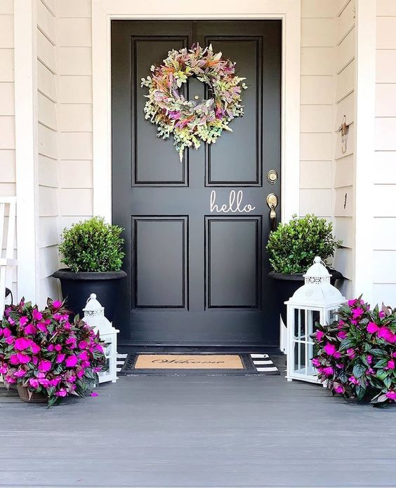 κομψή ανοιξιάτικη βεράντα με φωτεινά άνθη σε γλάστρες, φανάρια κεριών και ένα μοντέρνο στεφάνι λουλουδιών στην πόρτα
