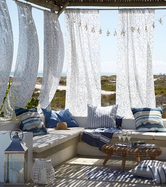 μια δροσερή μεσογειακή βεράντα με τσιμεντένιο πάγκο και εμπριμέ μαξιλάρια, φανάρια με κεριά, ψάθινο τραπέζι και εμπριμέ κουρτίνες