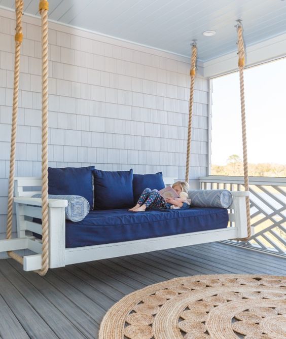 μια υπέροχη βεράντα με κρεμαστό ανάκλιντρο και μια ξαπλώστρα με μπλε μαξιλάρια
