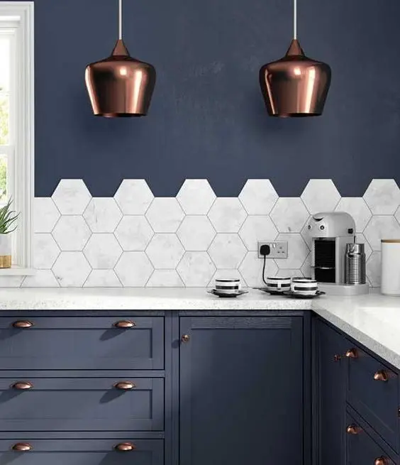 μαρμάρινα εξάγωνα πλακάκια και πάγκοι ξεχωρίζουν σε αυτό τη μπλε-γκρι κουζίνα με χάλκινες πινελιές