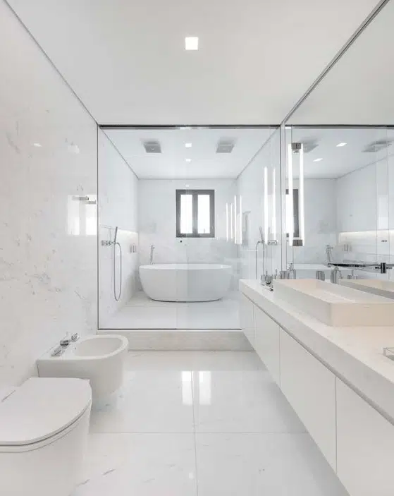 ένα κομψό λευκό μινιμαλιστικό μπάνιο με μαρμάρινα πλακάκια μεγάλης κλίμακας, λευκά έπιπλα, λευκές συσκευές και λευκά εξάγωνα πλακάκια