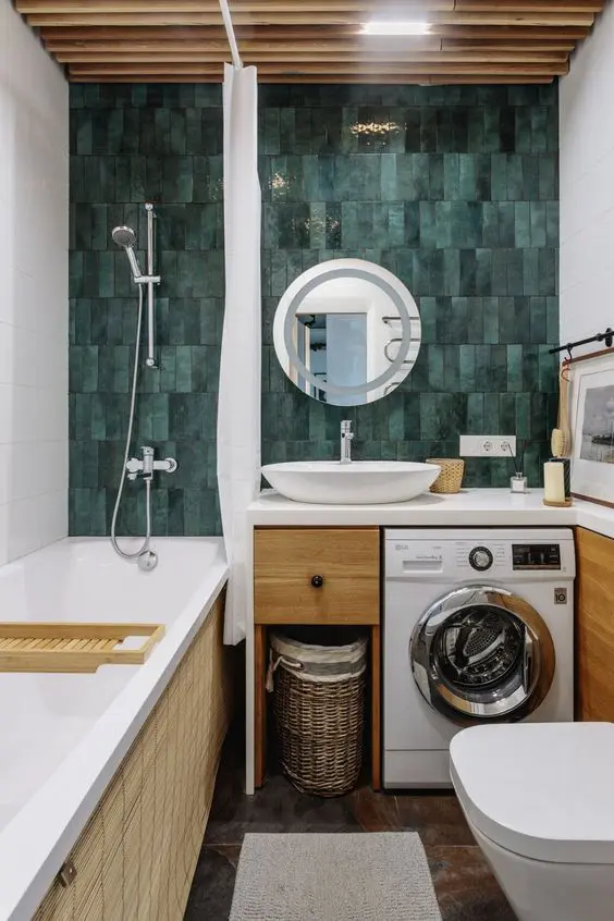 ένα φωτεινό μπάνιο με πράσινο τοίχο από πλακάκια, μπανιέρα, ξύλινο νεσεσέρ με ενσωματωμένο πλυντήριο