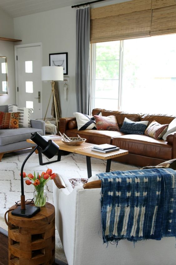 ένα boho σαλόνι με έναν καφέ δερμάτινο καναπέ, έναν πάγκο ως τραπεζάκι, ουδέτερα έπιπλα καθιστικού, λουλούδια και φωτιστικά