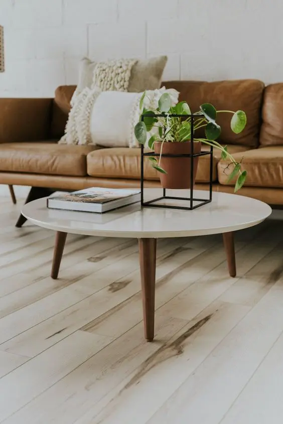 ένα όμορφο και διαχρονικό μοντέρνο τραπεζάκι σαλονιού με λευκή στρογγυλή επιφάνεια και πλούσια κωνικά πόδια