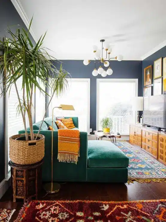 ένα πολύχρωμο σαλόνι με μια λεκιασμένη μονάδα αποθήκευσης, έναν μπλε βελούδινο καναπέ, ένα ριγέ τραπεζάκι, πολύχρωμες καρέκλες, ένα φωτεινό φωτιστικό δαπέδου και έναν τοίχο με επένδυση