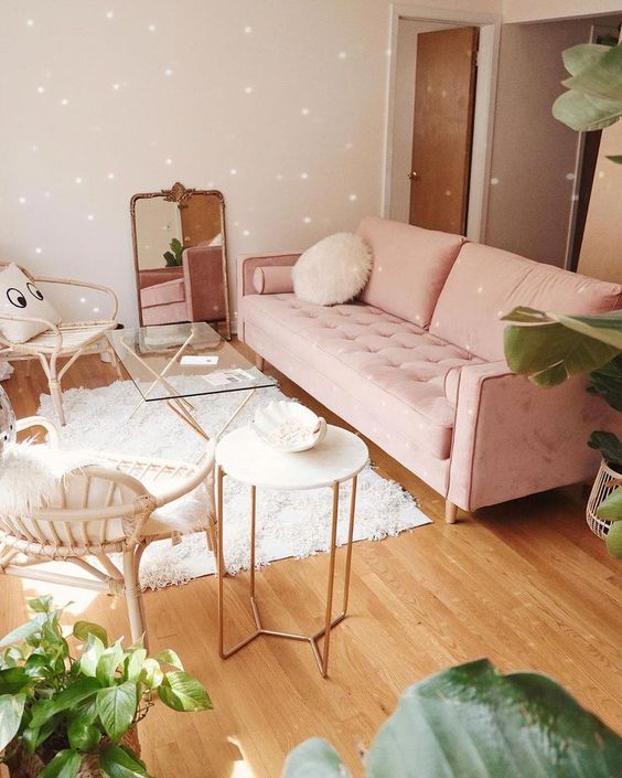 ένα ουδέτερο σαλόνι με ροζ πινελιές, με ροζ καναπέ, παστέλ μαξιλάρια και κουβέρτες και φυτά σε γλάστρες