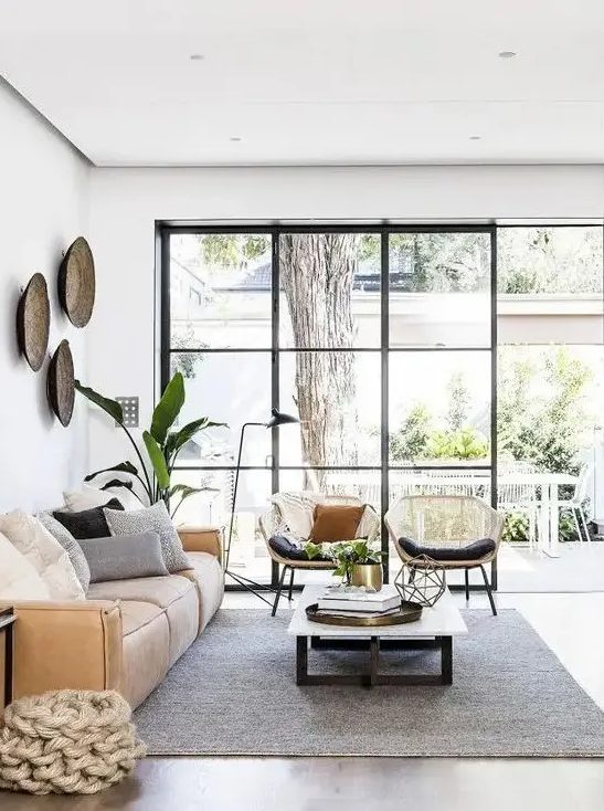 ένα όμορφο σαλόνι με τοίχο με τζάμι, έναν χαμηλό δερμάτινο καναπέ, ένα χαμηλό τραπεζάκι, καρέκλες από ψάθα και φυτά σε γλάστρες
