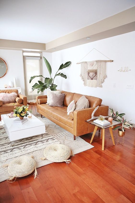 boho καλοκαιρινό σαλόνι με ενσωματωμένο τζάκι, δερμάτινη καρέκλα και υφαντά πουφ