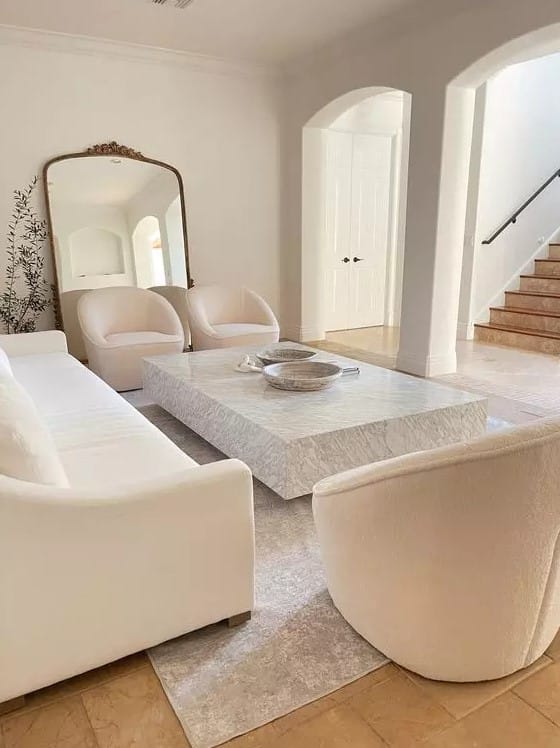 ένα όμορφο λευκό σαλόνι με έναν λευκό καναπέ και κρεμ καρέκλες, ένα τραπεζάκι σαλονιού από πέτρινη πλάκα και έναν μεγάλο καθρέφτη δαπέδου