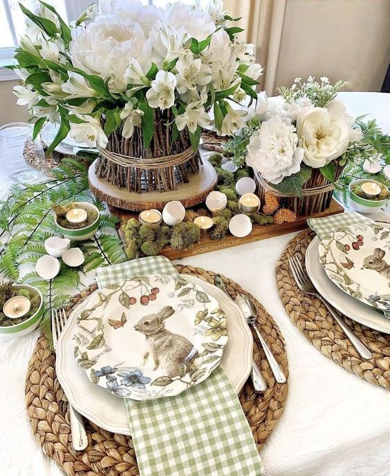 Ας ξεκινήσουμε από το τραπέζι – πώς να το διαμορφώσετε για το Πάσχα με ρουστίκ τρόπο; Επιλέξτε ένα συνδυασμό χρωμάτων, για παράδειγμα, ουδέτερα ή ροζ και πράσινο. Η λινάτσα είναι ένα ρουστίκ ύφασμα και μπορείτε να το χρησιμοποιήσετε για τη δημιουργία τραπεζιών, σουπλά και κεντρικών κομματιών. Καλάθια, κλαδιά δέντρων, λουλούδια και βρύα, είναι τα απαραίτητα υλικά για να δημιουργήσετε ένα ρουστίκ σχέδιο. Χρησιμοποιήστε καρό τραπεζομάντιλα και χαρτοπετσέτες, κεντρικά κομμάτια με καλάθια και φυσικά λουλούδια και ακατέργαστες ξύλινες ζαρντινιέρες με φωτεινά λουλούδια. Φωλιές με ψεύτικα αυγά, κουνελάκια από βρύα, κέλυφος αυγών και συνηθισμένα κεριά και πολλές άλλες λεπτομέρειες αυτού του άνετου στυλ.