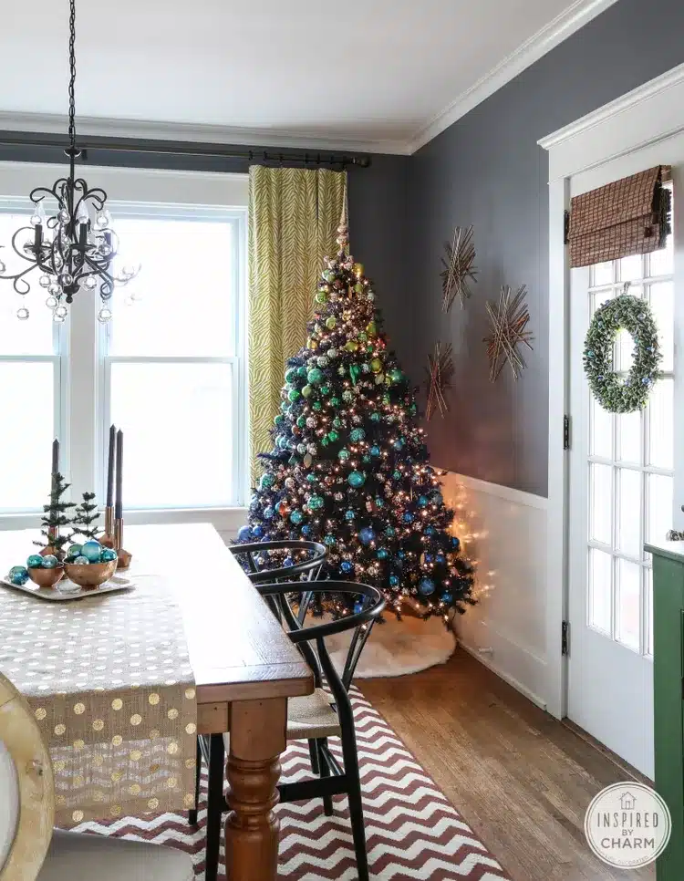 Ξεκινώντας με μια μπλε βάση για χριστουγεννιάτικο δέντρο, δημιούργησε ένα εφέ ombre προσθέτοντας λαμπερά μπλε στολίδια με μπάλα στη βάση του δέντρου, φτάνοντας μέχρι το ανοιχτό πράσινο στην κορυφή για ένα ντεγκραντέ εφέ. Χάλκινα στολίδια πασπαλισμένα παντού και ένα χάλκινο κάλυμμα προσθέτουν ζεστή λάμψη.