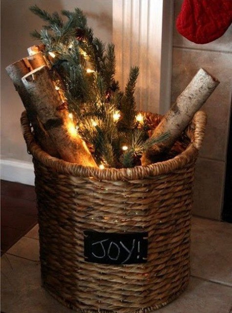 ένα καλάθι με κλαδιά από έλατο, καυσόξυλα και φωτάκια