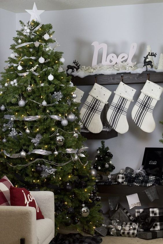ένα εξαιρετικά μοντέρνο χριστουγεννιάτικο δέντρο από λευκό και ασημί έως μαύρο συν ασημί κορδέλα και φωτάκια για μονόχρωμο χώρο
