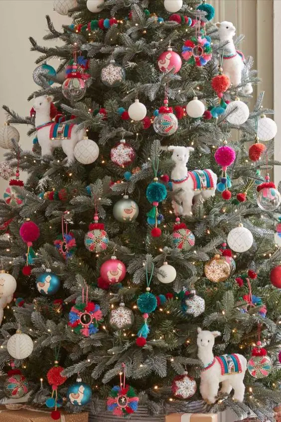 ένα χριστουγεννιάτικο δέντρο στολισμένο με πολύχρωμα στολίδια, πομπόν και φωτάκια