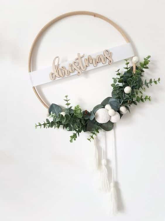 κομψό σκανδιναβικό χριστουγεννιάτικο στεφάνι με ξύλινα γράμματα, πράσινο, χιονόμπαλες και φούντες