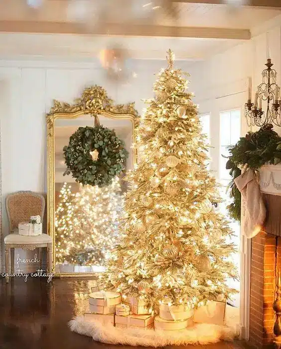 ένα χρυσό χριστουγεννιάτικο δέντρο διακοσμημένο με λευκά στολίδια είναι υπέροχο για έναν glam χώρο