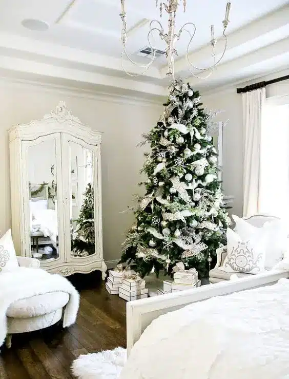 ένα υπέροχο υπνοδωμάτιο με λευκές γούνες, ένα ασημί και λευκό χριστουγεννιάτικο δέντρο και λευκά έπιπλα