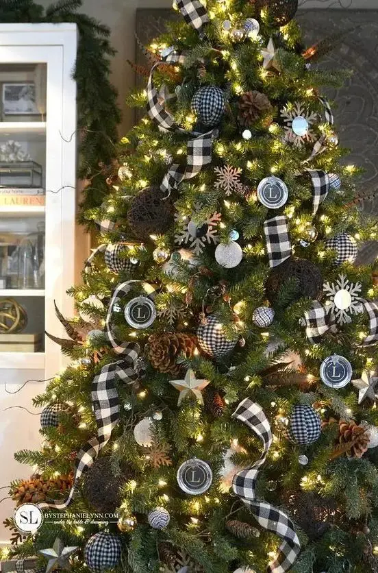ένα όμορφο χριστουγεννιάτικο δέντρο με χάντρες, καρό αστέρια, μεταλλικά στολίδια και κουκουνάρια