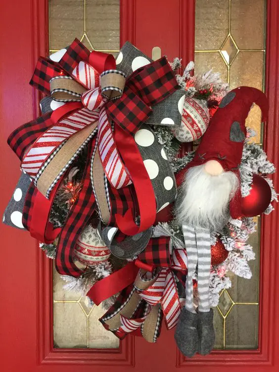 ένα ερυθρόλευκο χριστουγεννιάτικο στεφάνι με πολλές λινάτσες, κόκκινες, άσπρες και γκρι κορδέλες, κόκκινα και λευκά στολίδια και ένα μεγάλο καλικάντζαρο με κόκκινο καπέλο