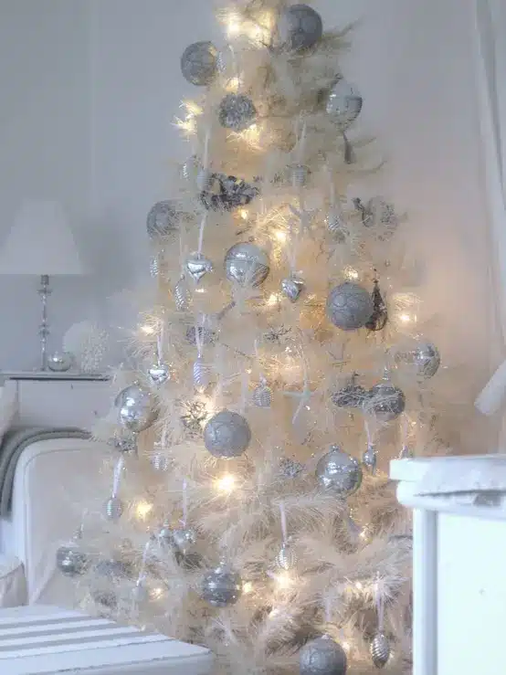 ένα μαγικό λευκό χριστουγεννιάτικο δέντρο με πολλά ασημί και λευκά στολίδια και φωτάκια για έναν vintage χώρο