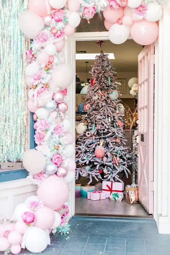 ένα φανταστικό ροζ μπαλόνι, ροζ παιώνια, γυαλιστερή γιρλάντα και ένα χριστουγεννιάτικο δέντρο με παστέλ στολίδια και χάντρες