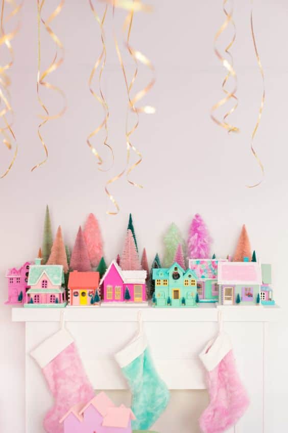 ένα τολμηρό χριστουγεννιάτικο τζάκι με ροζ, μέντα, ζεστά ροζ σπιτάκια, ασορτί χριστουγεννιάτικα δέντρα με πινέλο και ασορτί κάλτσες