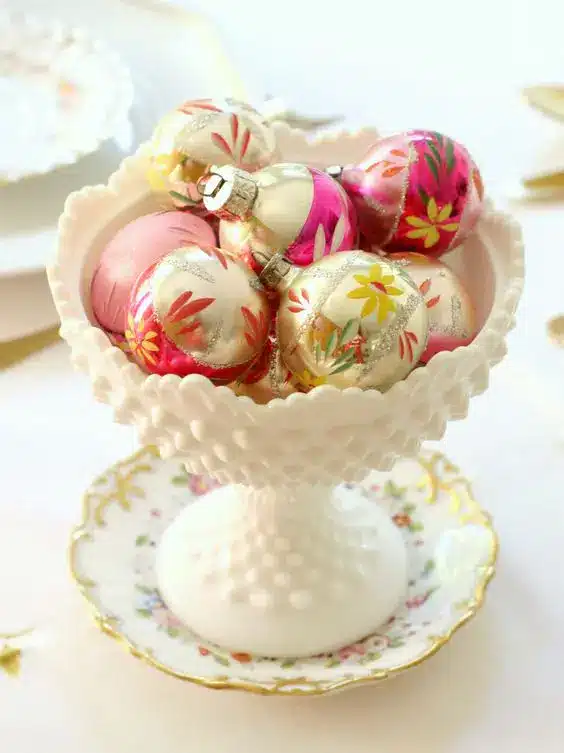 ένα μπολ με vintage στολίδια είναι ιδανικό για vintage διακόσμηση