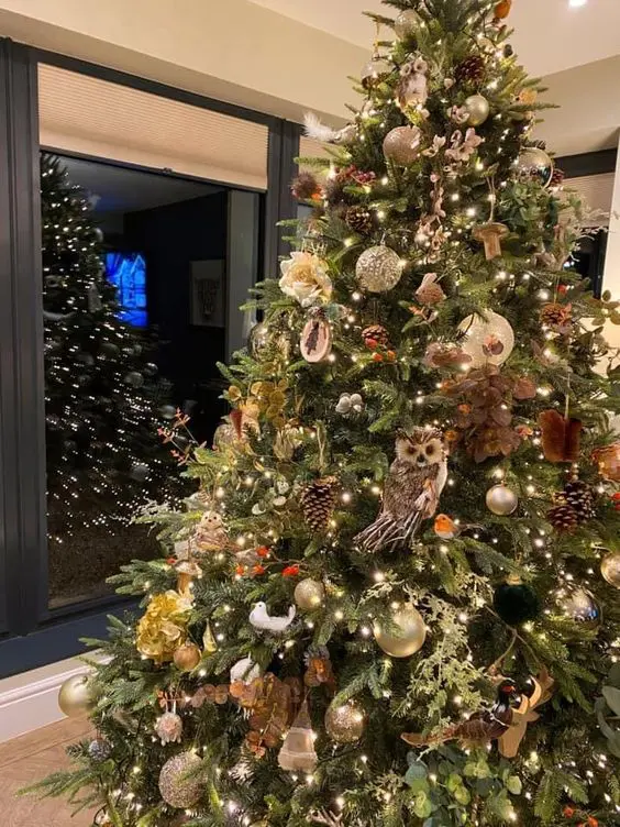 ένα τολμηρό woodland glam χριστουγεννιάτικο δέντρο με χάλκινα και καφέ στολίδια, κουκουνάρια από πούλιες, φωτάκια, φύλλα και κουκουβάγιες που κρέμονται