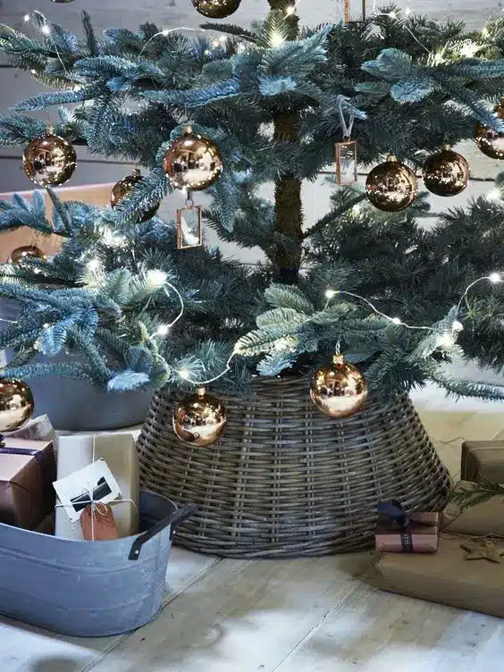 ένα χριστουγεννιάτικο δέντρο με χάλκινα στολίδια και ένα καλάθι που κρύβει τη βάση του δέντρου