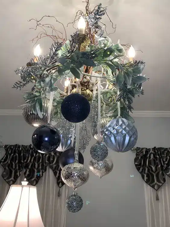 ένας όμορφος χριστουγεννιάτικος πολυέλαιος από μπλε, γαλάζια και ασημί στολίδια, παγωμένα κλαδιά και κεριά