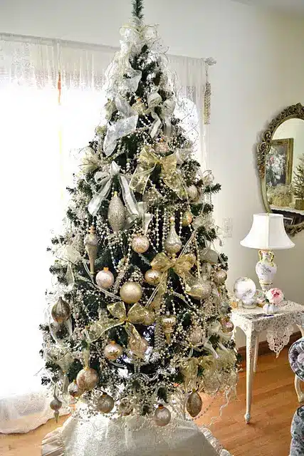 ένα λαμπερό glam χριστουγεννιάτικο δέντρο στολισμένο με χρυσά στολίδια διαφόρων σχημάτων, λευκούς φιόγκους, γιρλάντες με χάντρες με πέρλες είναι μια όμορφη ιδέα